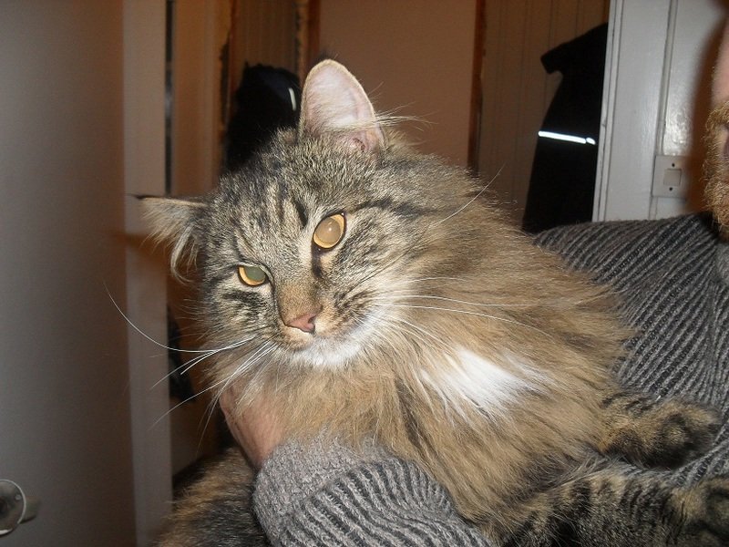 Vakker hannkatt, kastrert og kosete. Pelsen er grå/brun. "krans" rundt halsen