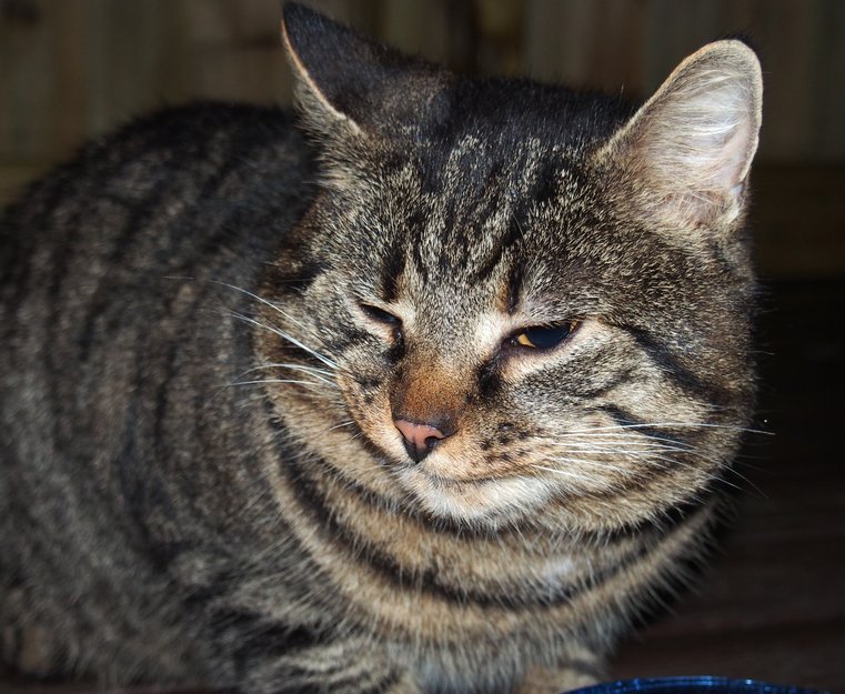 Katten er ikke i dårlig hold, og jeg lurer på om den får mat andre steder. Av og til veldig sulten.