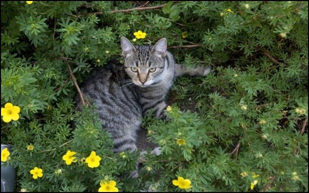 Liten, spebygd hannkatt med grå og sorte striper og hvite poter. Veldig tillitsfull og snill. Han lyder navnet Kasper.
