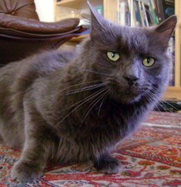 "Store Grå" er en kraftig hannkatt med semilanghåret helgrå pels.
