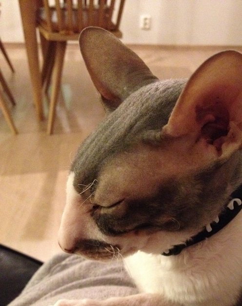 Kort tynn krøllete pels. Har svart halsbånd med refleks på og brikke med telefonnummer på.