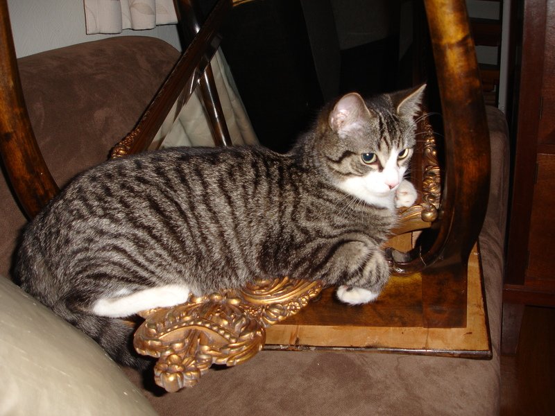 Slank stripete, skogkattaktig hannkatt med mye hvitt under. En mørk flekk på haken. Svært kjærlig og tillitsfull. Han kan ha funnet et nytt hjem hvis noen gir ham mat der.