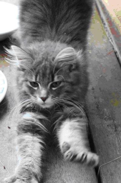 Søt liten hokatt, ganske langhåra, og kan vere ekte skogskatt, men kan også vere blanding. Ganske kvit framme, ellers mørk grå på ryggen, og kvite striper på sidene framme, med litt brunt i. Veldig leiken, og trass i ung alder ser den ut til å ha lite forståelse for korleis oppføre seg med andre kattar. Klorar ikkje folk.