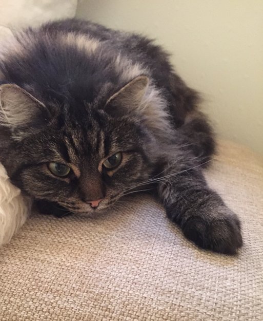 Hun har lang pels, "M" mønster i pannen og mørk grå/svart farget.