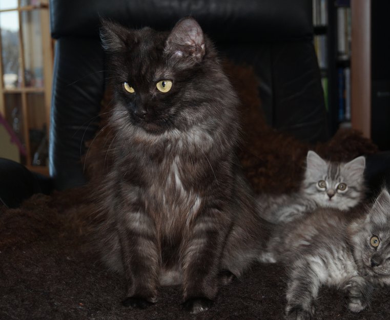 Molly har sølvgrå underpels, overerpelsen er svart med brunskjær i. Katten er langhåra. 1,5 år.