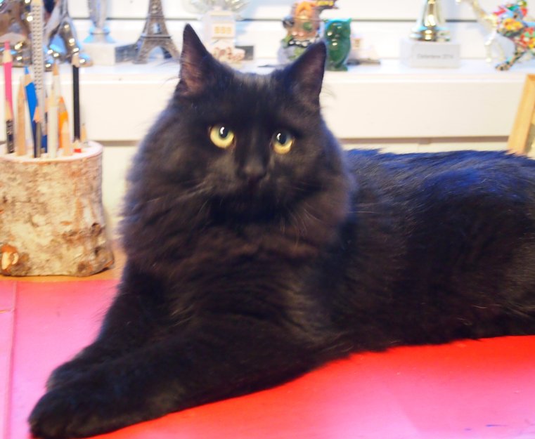 Svart hankatt med halvlang pels. Ca. 10 måneder gammel. Nysgjerrig og kjælen katt, kan være litt skvetten.