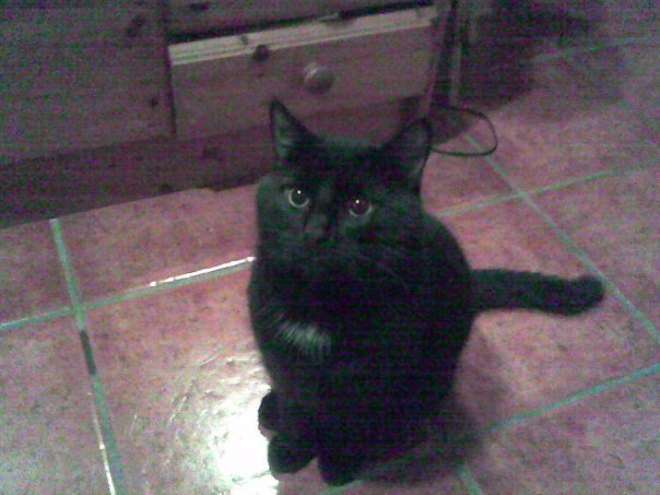 Helt svart katt,Mangler en av hoggtennene oppe i munnen,Veldig snill og god
