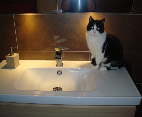 Han er hvit på undersiden av kroppen og på labbene. Har en svart flekk i munn/leppe på venstre side.