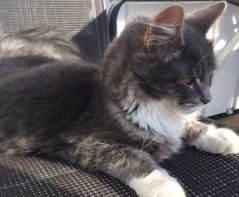 Flott grå og litt hvit hunkatt(ikke shippet) vandrer rundt husene våre øverst i Hasselbakken. Sulten, selskapssyk og savner tydelig eierne sine.
