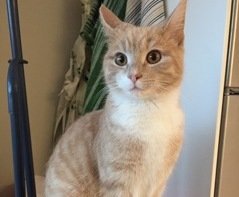 Leo er løvefarget (rød mot beige) med hvitt bryst og gyldne øyne. Grønn ID-merking i venstre øre.
