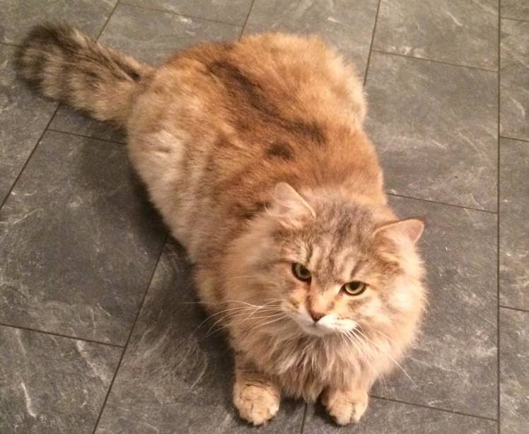 Cesar er en Sibirkatt med lang gråstripete pels (sølvtabby) som dessverre er litt klumpete fortiden. Han er veldig matglad, kosete og nysgjerrig så håper at han har gjemt seg i en garasje eller lignende.