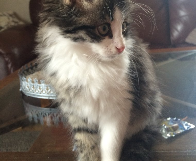 Den fremste høyrepoten er grå og svartstripet. Katten er normal rundt vekten og hun er cirka 1 år gammel. Hun er veldig nyskjerrig og glad i all slags mat.