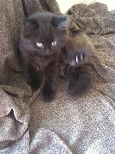 Liten sort langhåret kattunge. Nesten helt sort (mørk koksfarge)
