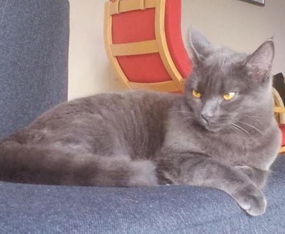 Sinda er helt grå, men har svake striper i pelsen. Hun er ID-merket, så det står ID med blå bokstaver i øret. Hun har gule øyne