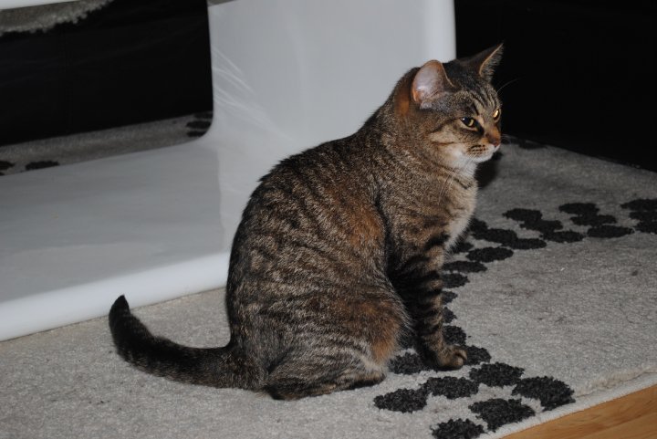 Hun er en liten hunnkatt, når hun forsvant var hun litt tykk. Hun har brun, spraglete pels, det kan minne litt om striper av svart. Brystet hennes er lysere enn resten av kroppen.