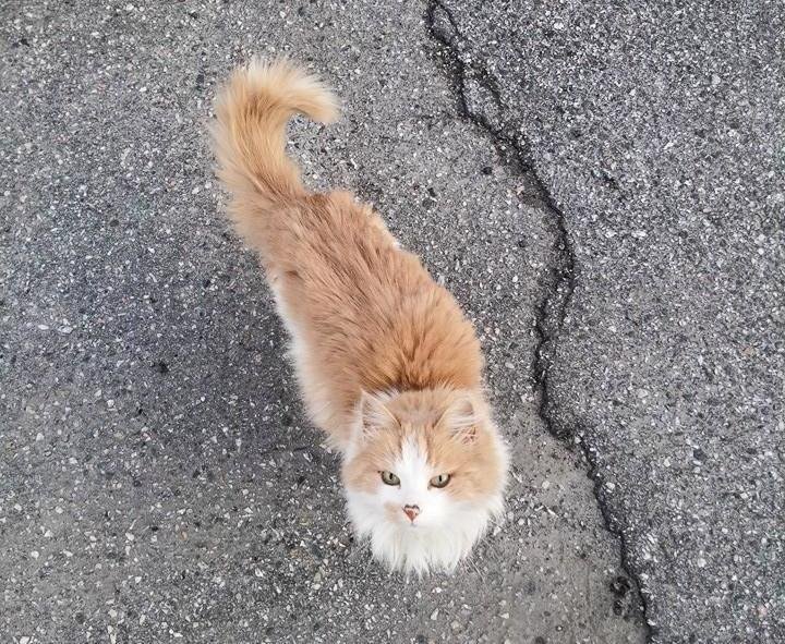 Katten går ute i området her, har sett den periodevis utenfor huset mitt og andre steder i området av og på f.o.m før jul 2014. Den er avmagret og tynn, kontaktsøkende og tillitsfull.