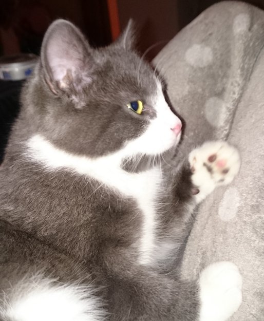 Grå og hvit katt. Hovedsaklig grå.