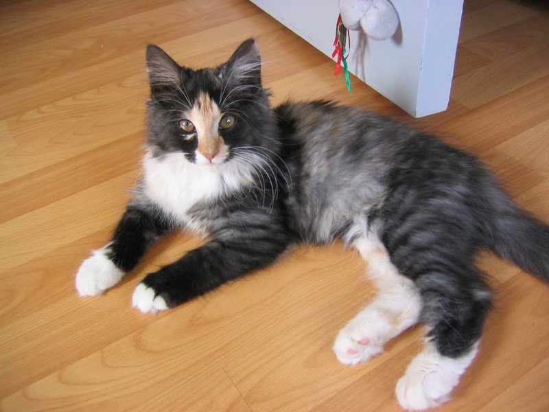i ørene.Hvit pels nederst på potene og på brystet.Lang bustete hale med litt lys pels på enden.Kontaktsøkende og kosen.Noe større enn på bilde.