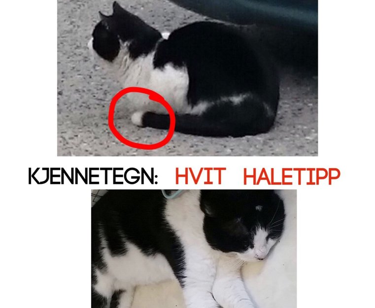 Sort og hvit hannkatt er på ville veier. Han har sort hale med hvit haletipp. Alle tips og observeringer mottas med stor takk!