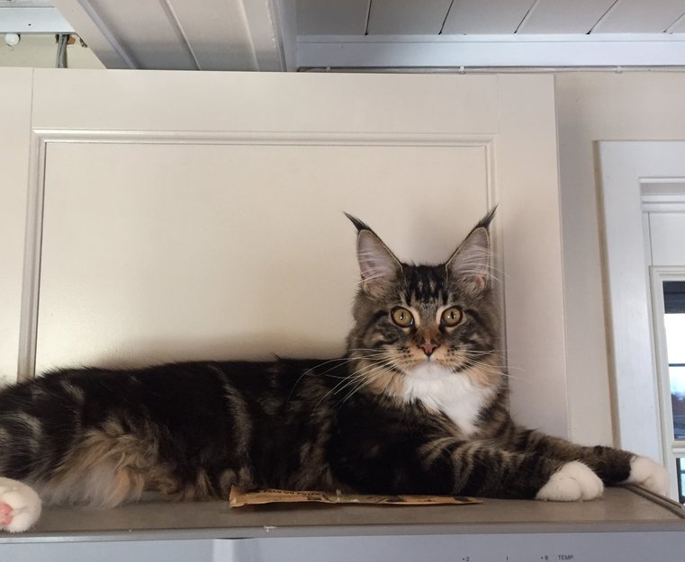 Nala har store ører, ligner på en gaupe. Bruntabby. Stor buskete hale og hvite "strømper" på bakbena og hvite poter på forbena.