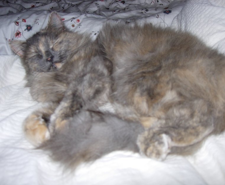 9 år gammel hunkatt med masse pels, som ofte er rufsete, hun har id-tatto i det ene øret, men det er blitt ganske utydelig med årene.