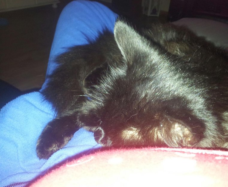 Stor svart hannkatt, mye pels(skipskatt). Litt brunskjær i pelsen