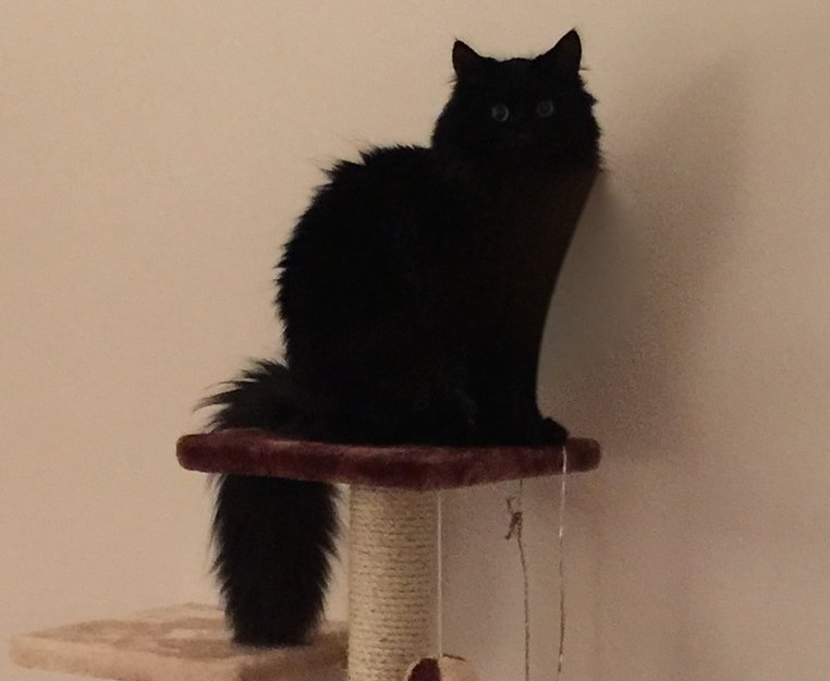 Han er svart langt håret,kan se litt brun ut på magen. Har veldig tykk,lang og fin hale. Brune store øyne.
