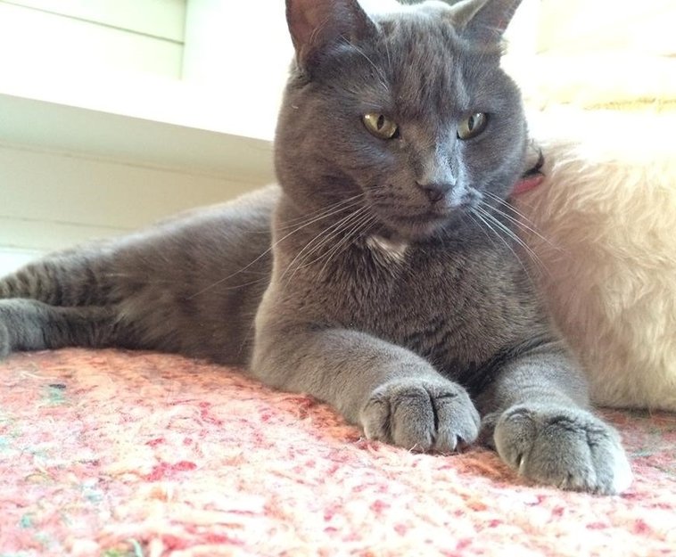 Elux er helt grå med litt hvitt under halsen, veier rundt 4 kg, er litt over to år gammel. Da hun forsvant hadde hun et rosa bånd med navn og telefonnummer.