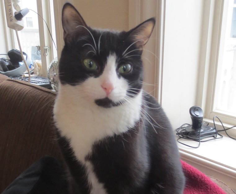 Veldig sosial og nysgjerrig, store øyne. Mjauer normalt, men liker ikke å bli holdt så hun piper veldig tynt når hun blir plukket opp. 1 år gammel, relativt liten for alderen (men ikke mager).