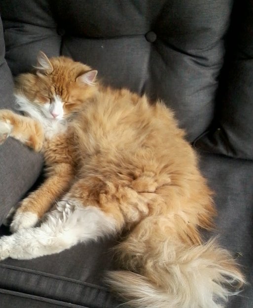 Langhåret og rødbrun/hvit . Halsbånd med bjelle og en hjertemedaljong med navn på katt og telefonnummer
