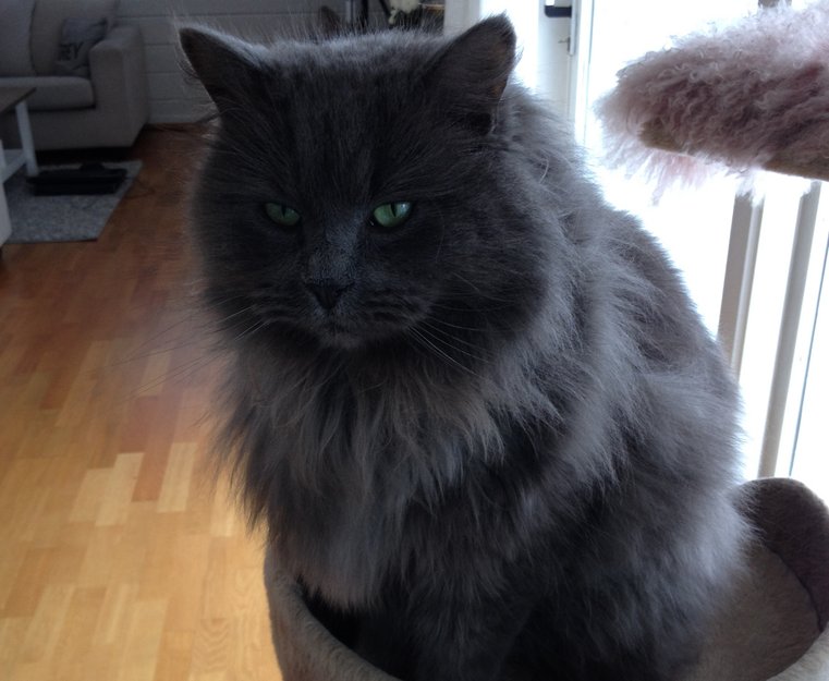 Kraftig, ca 6 kg. Lang pels, med noen kortklipte partier pga tover.
