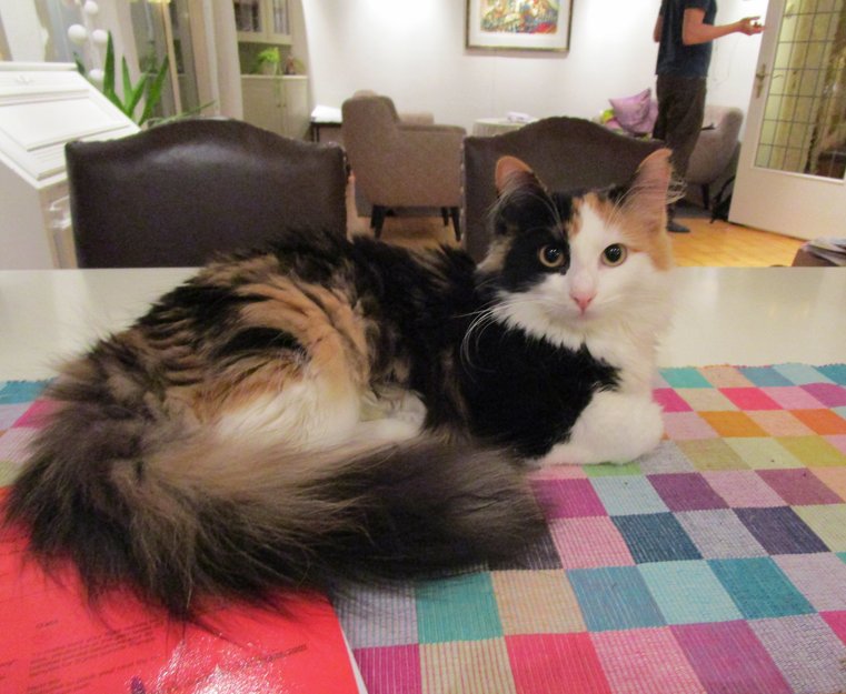 Da vi sto opp i morrest, hadde pus kommet inn gjennom katteluken, som om ingenting hadde skjedd, etter fem dager. Like blid og fin, men litt ekstra kosete. Både hun og vi er veldig fornøyd med at hun er hjemme igjen, stor gjensynsglede. Nå må vi på tur i nabolaget og ta ned 30 plakater, men det er bare hyggelig ;)