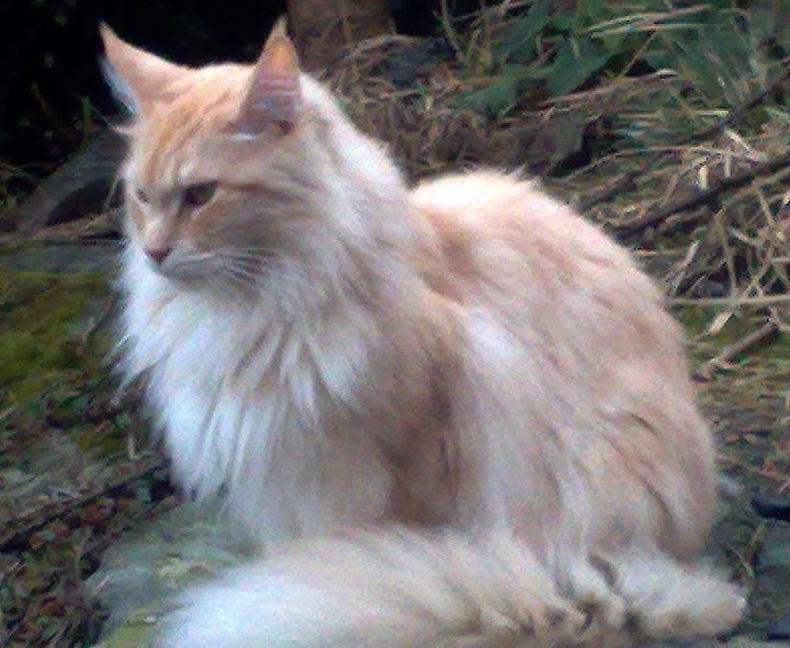 Katten er ganske stor, men veldig sky. Kan virke litt redd og skvetten.