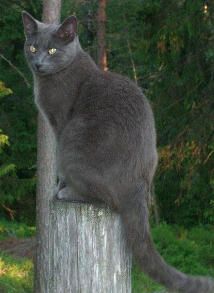 Slank ung jevnt grå hankatt. Svake striper på halen. Normalt veldig kjælen og sosial.