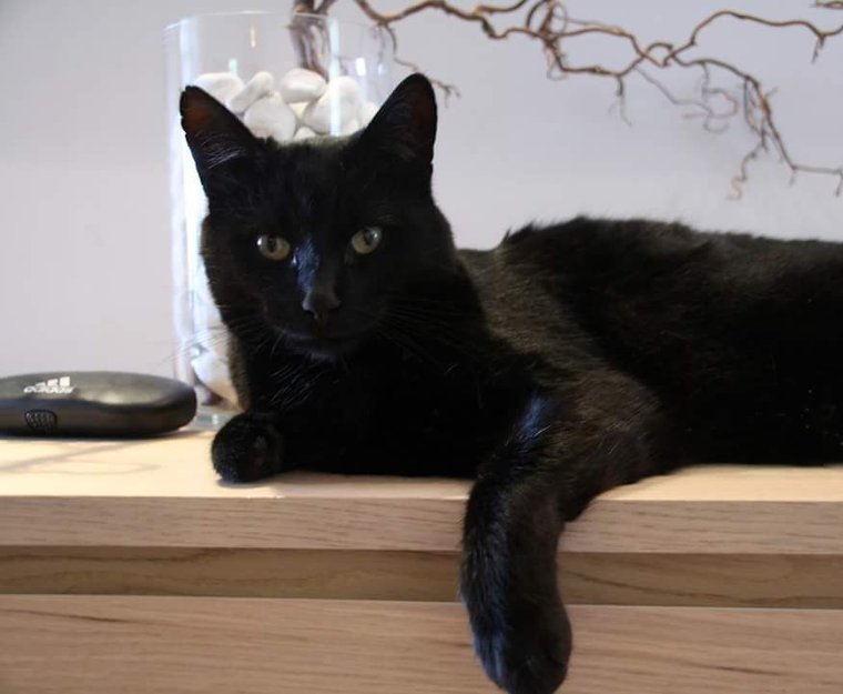 Kjennetegn: Svart men har et brunlig skjær i sollys, 5 år, kraftig bygd, veier 6 kg, har lang hale, litt tynt spesielt ansikt, er chippet.
