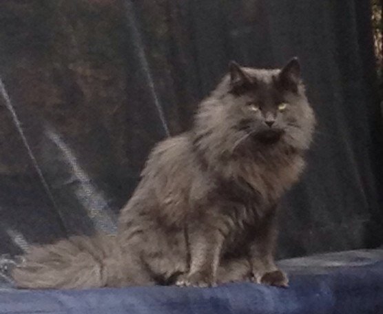 Ensfarget grå langhåret hankatt. Buskete hale.