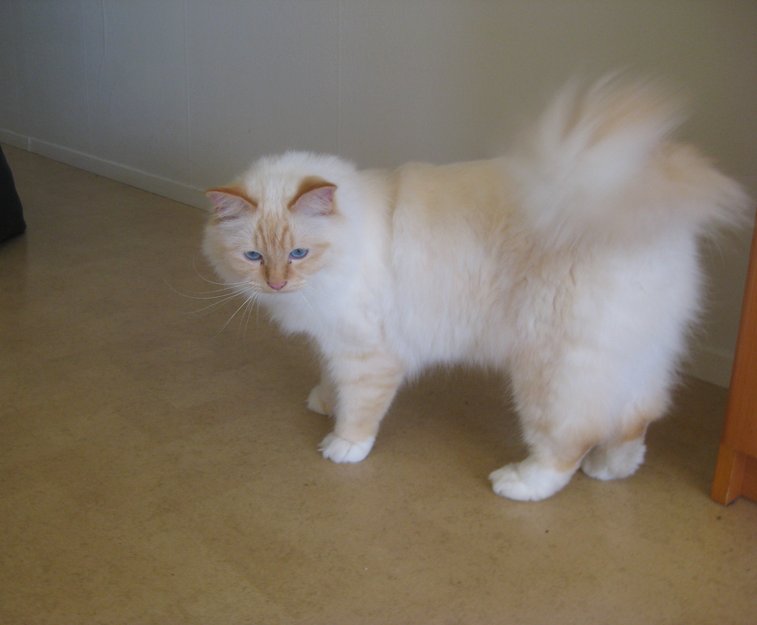 Jeg er en kremfarget hellig Birma, har halsbånd med telefon-nr hjem. Blå øyne og kremfarget i ansiktet, ørene og bena, eller så har jeg hvit pels.