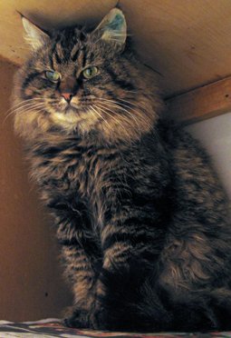 "Runar" har semilanghåret brunsvart tigret pels, med beige rundt snuten og brystet.