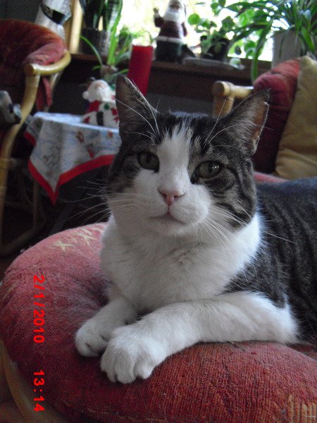 han er gråstripete og hvit.. med et hakk i venstre øre. han har muligens på seg et svart halsbånd av strikk med navnelapp på, og han er chipet, med ID tatoert i øret. han er veldig kosete og gla i mennesker.