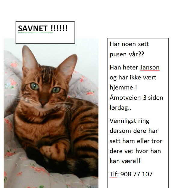 Janson er en svært hjemmekjær og sosial katt på snart 1 år. Han er kastrert og har aldri vært borte over natten før. Lørdag 18.04 er siste gang vi så ham hjemme.