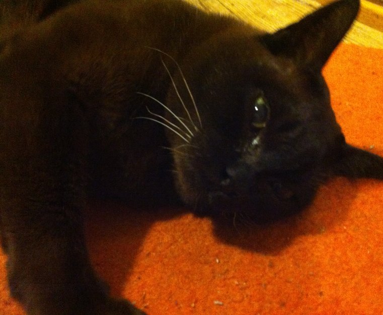 Katten er svart med brunskjær. Han har noen krumme værhår på v/side. Han har noen hvite/gråe hår her og der som bare synes når man ser ham på nært hold. Liten og lett. Snorker når han sover. Er veldig kjærlig og tillitsfull, noe som gjør at jeg vet at det er en huskatt. katten kan også åpne dører som står på gløtt med labben.