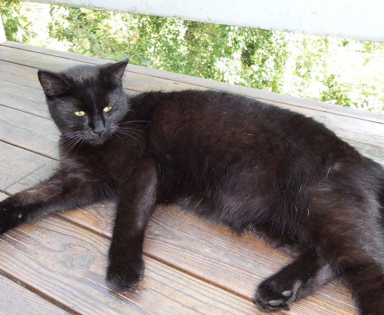 Helt svart med hengemage som hun fikk etter hun ble sterilisert. Grønn id tatovering i øret. Rosa halsbånd med adresse og nummer.