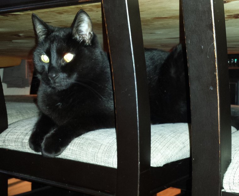 Han har ca 5 hvite hår på halsen som nesten ikke synes ellers helt svart og veldig tykk men kort pels.