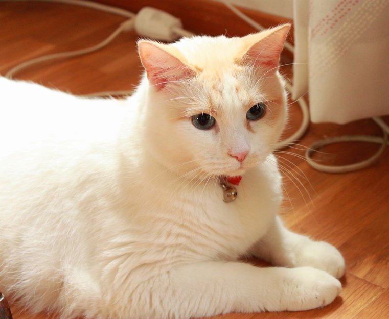 Hvit, kastrert hannkatt med blå øyne. Anelse lysebrunt over ørene og på halen. ID-tatovering i øret. Blått bjelle-halsbånd med kontaktinformasjon skrevet på innsiden.