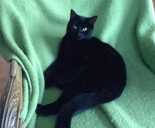 Hun er svart med noen få hvite hår på brystet. Gule øyne. Ca 3 år gammel, ikke spesielt stor. Blank og fin i pelsen. Liker vanligvis å bli klappet/kost med.