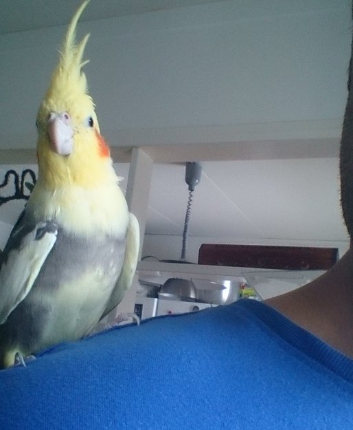 Nymfeparakitt, hun, veldig tam. Gul og hvit med røde prikker på sidene av hodet