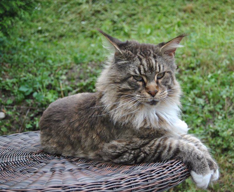 Neil er en typisk Maine Coon ,med "gaupetuster " på ørene , han har hvit krave og hvite poter .