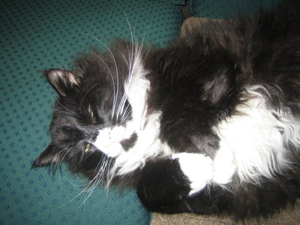 Ganske stor langhåret hannkatt, han er svart med hvit under haka, under magen og på potene. på haka har han en svart flekk i det hvite. han har halsbånd med telefonnummeret vårt på hvis han ikke har mistet det. han er ganske leken og stort sett glad i kos.