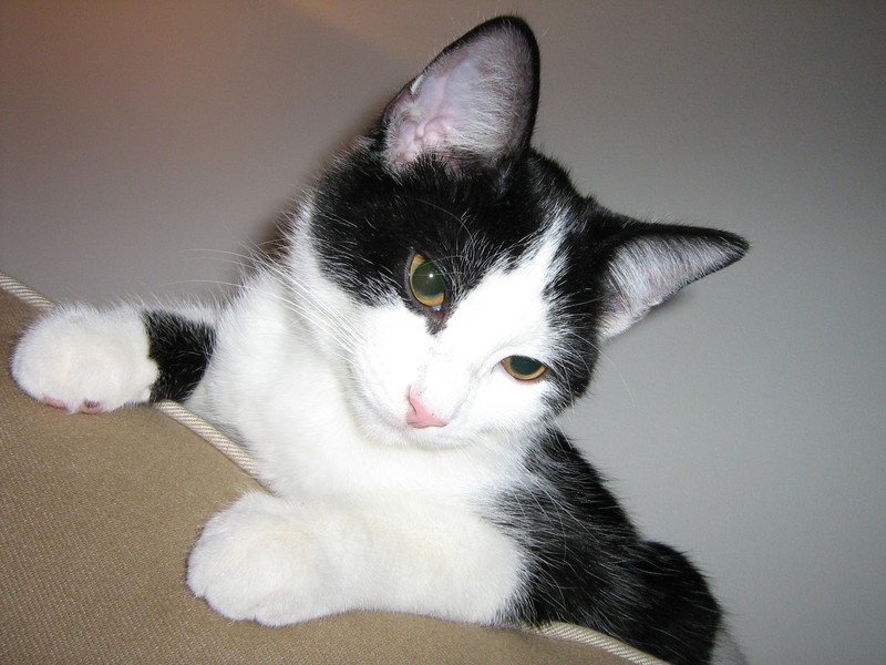 Lille-per er svart/hvit korthåra, og veldig tillitsfull. Han er for tiden på antibiotika og smertestillende for en ødelagt klo.
