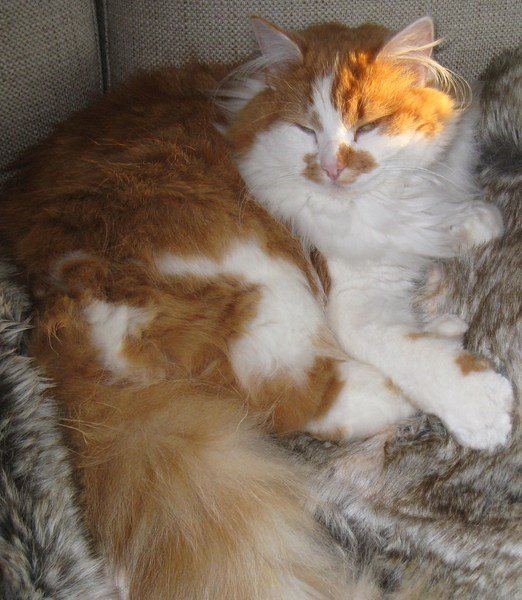 Rød på rygg/sidene og rødflekkete snute. Hvite bein og hvit krøllete mage. Tykk langhåret hale og hårete ører. Veldig snill og kosete. Liker å bli klådd på magen..